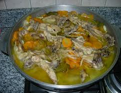 Все это складываем в сковороду, поливаем маслом. Его предварительно надо растопить. Обжариваем на этом самом масле. Когда поверхность немного подрумянится, добавляем корешки и вливаем готовый маринад. В этом всем мы и тушим наше творение, пока не будет тушка готова. Когда птица будет полностью готова, надо их разрезать на пару кусков, или на четыре – как нравится.